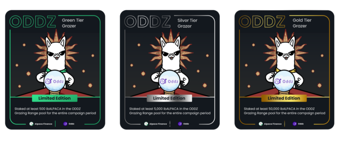 To be eligible, Users must stake ibALPACA in the ODDZ Grazing Range pool before June 18th, 10 AM GMT (1 day after the pool opens) and stake for at least 27 days. The NFT tier you receive will be based on the amount of ibALPACA staked.