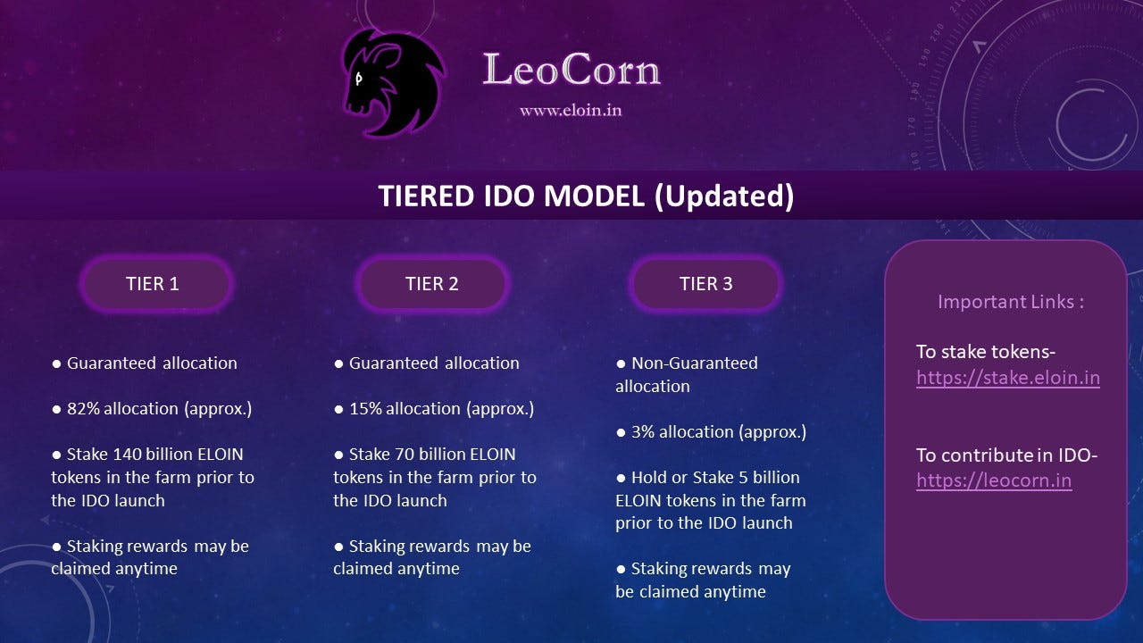 There are 3 tiers for ELOIN holders to enroll in an IDO (To be continued via ELOIN pool here)