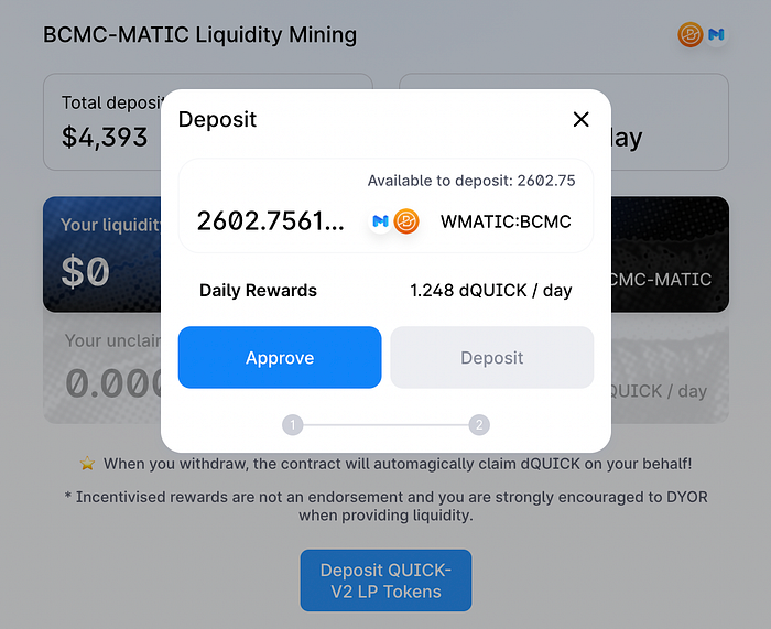 Starting 6th Jan 2022, users that stake their BCMC-MATIC Liquidity Provider (LP) pair will be able to receive dQUICK as a reward for using the QuickSwap LP mining program.